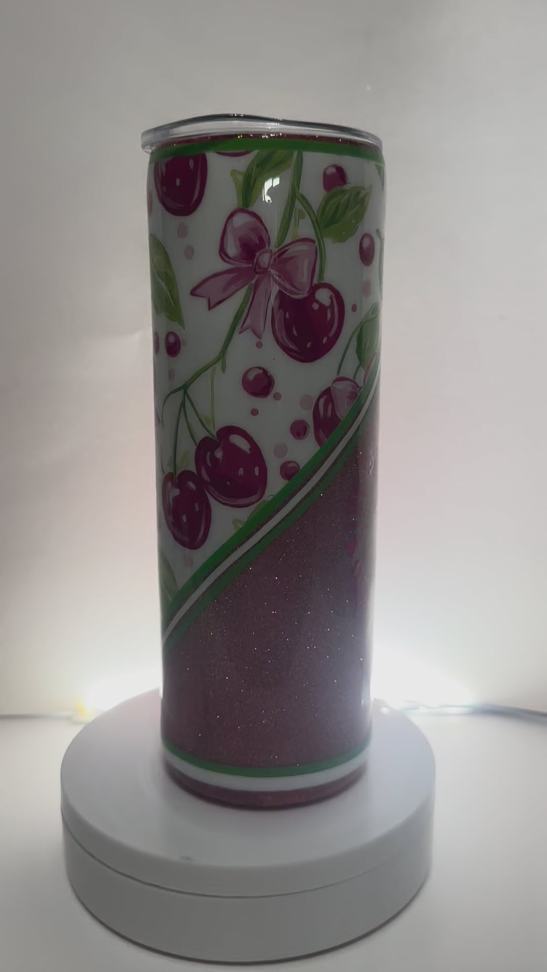 Savor every sip with this sweet & sassy handmade 20 oz skinny tumbler! Featuring a vibrant cherry design, shimmering pink glitter, and the uplifting quote: